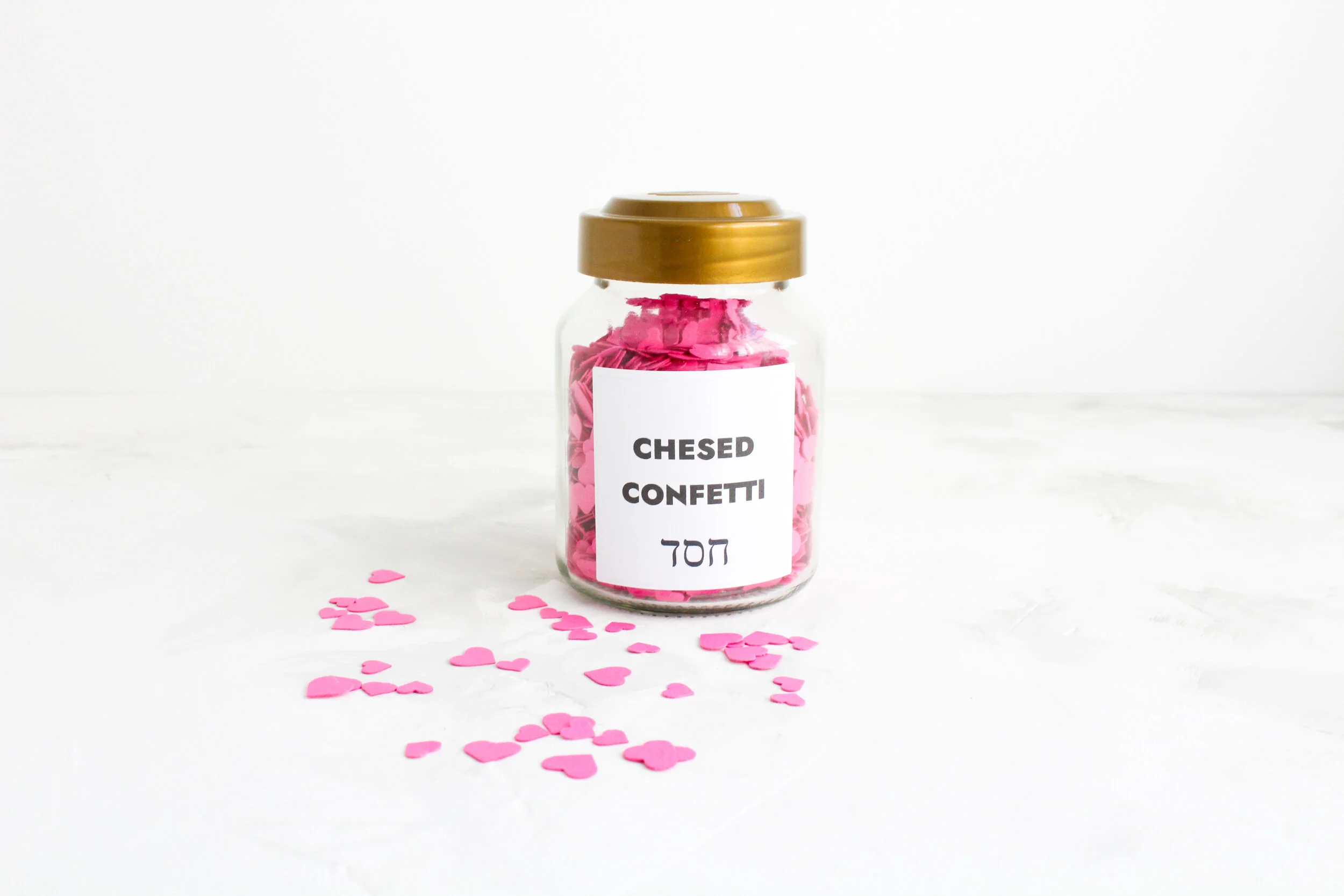 (1) Recycle a bottle or jar that has a shape you like — clean and dry it thoroughly. (2) Use a heart (or it could be a different shape) craft punch to create lots of little paper hearts. Please note that regular weight paper is easier for kiddos to work with. I used cardstock, and it took more muscle power! (3) Put the little hearts in your bottle. (4) Label the bottle “Chesed Confetti.” If you like, you can use the TEMPLATE I used to make the label seen in the photos. (5) Now, wherever you go, sprinkle some chesed — both your Chesed Confetti and actual chesed — to make the world a better place!