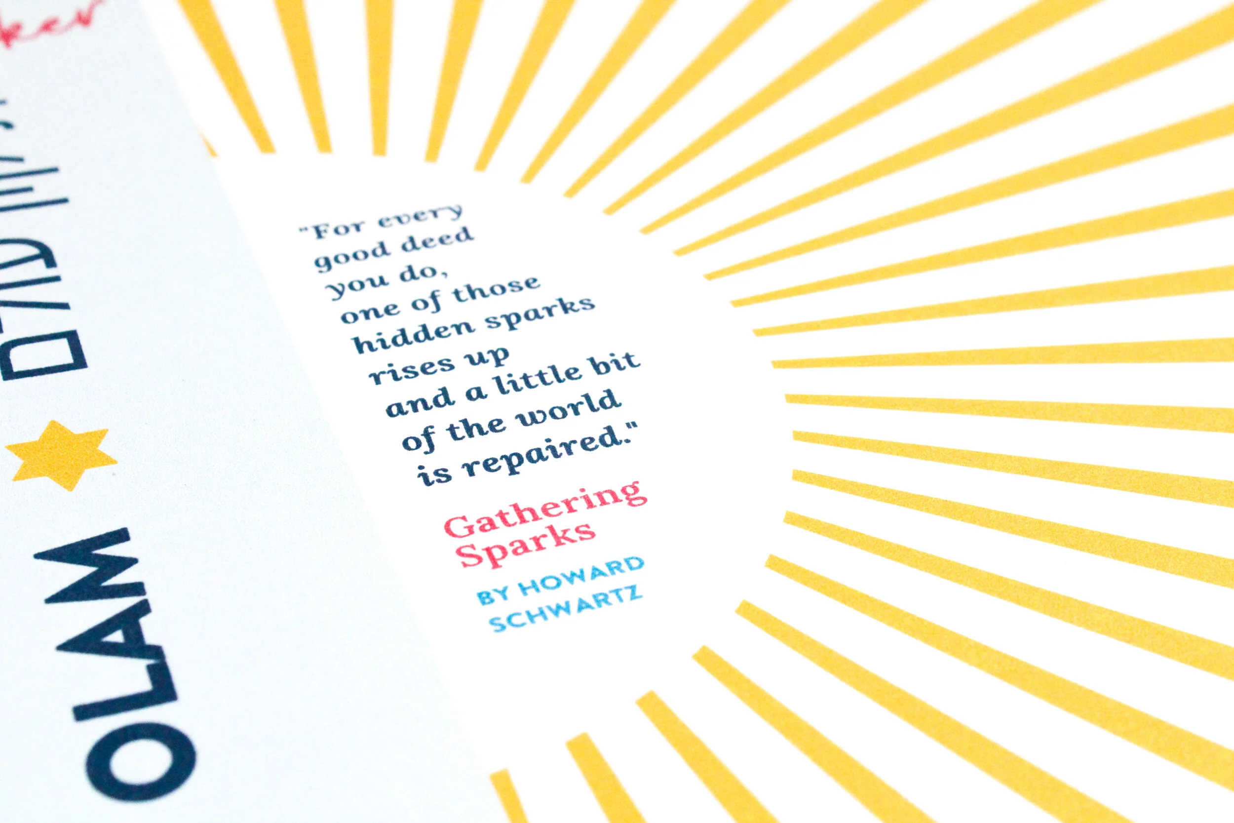 (1) If possible, read Gathering Sparks (by Howard Schwartz) to your kiddos. (2) Print the Tikkun Olam Sparks Tracker PDF. (3) Now it’s time to start freeing sparks and making the world a better place! (4) For the GRID version, kiddos can put a sticker or stamp in each box, or they could draw something in each box; for the RAYS version, kiddos can color in a ray each time they free a spark; for the STAR version, they can color the Star of Davids.
