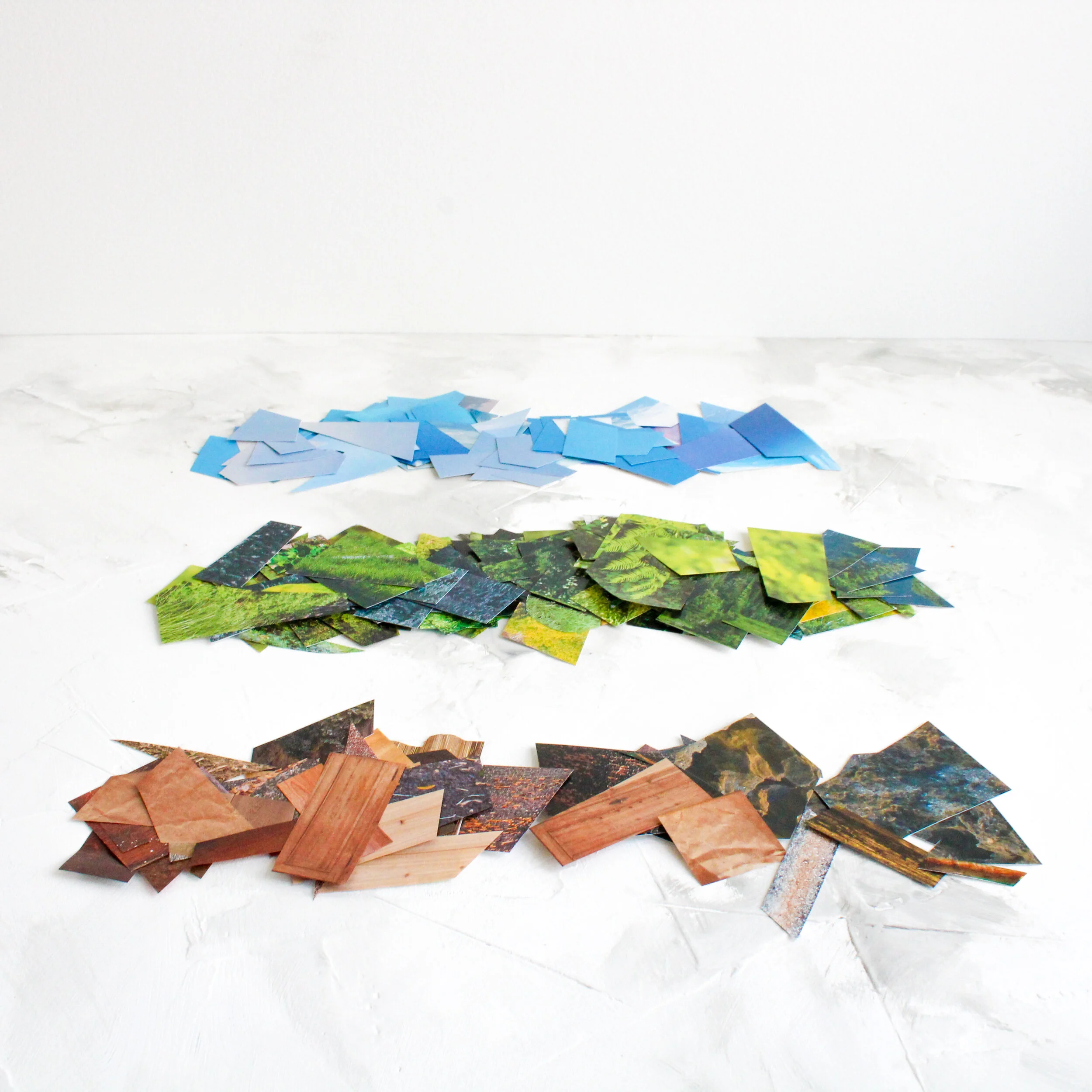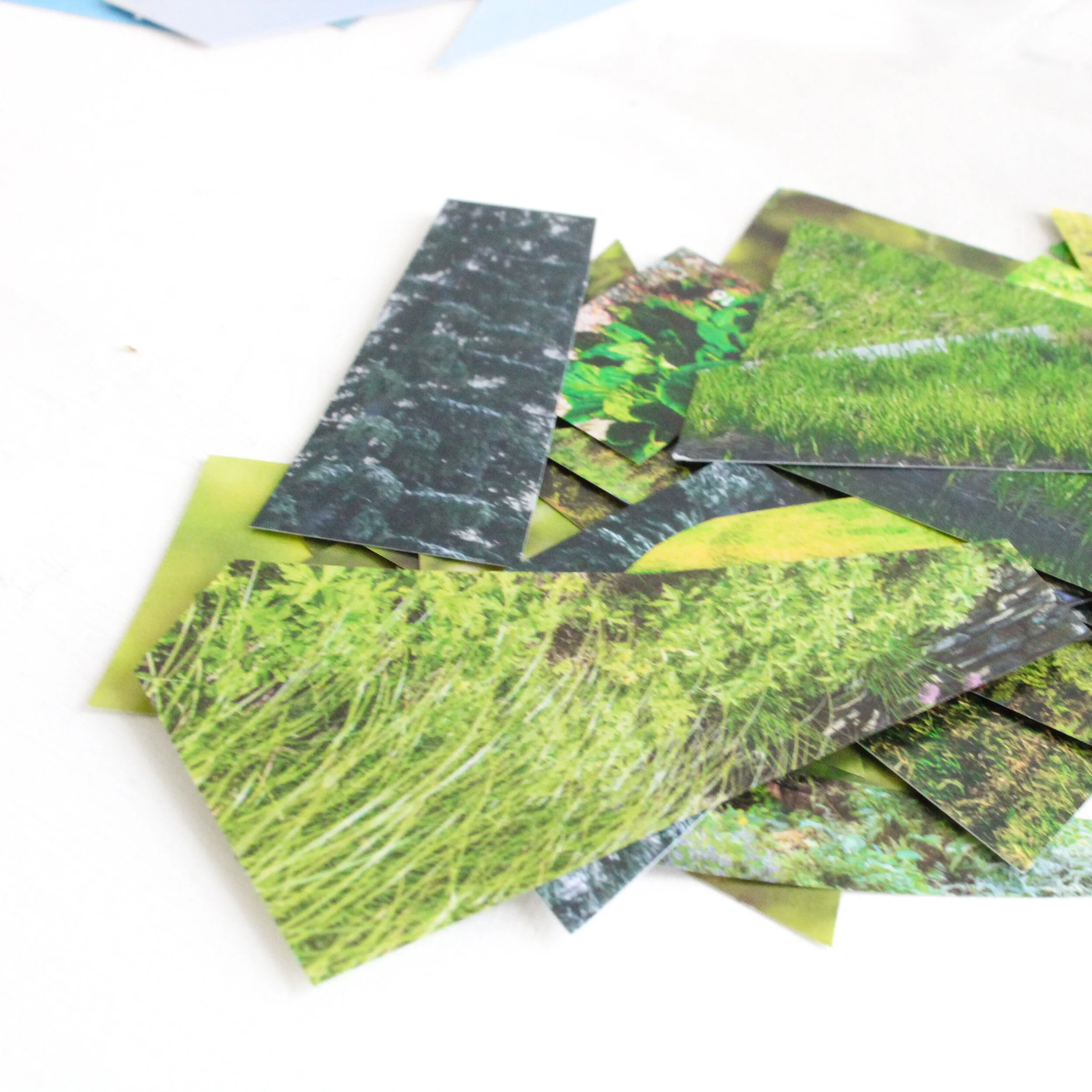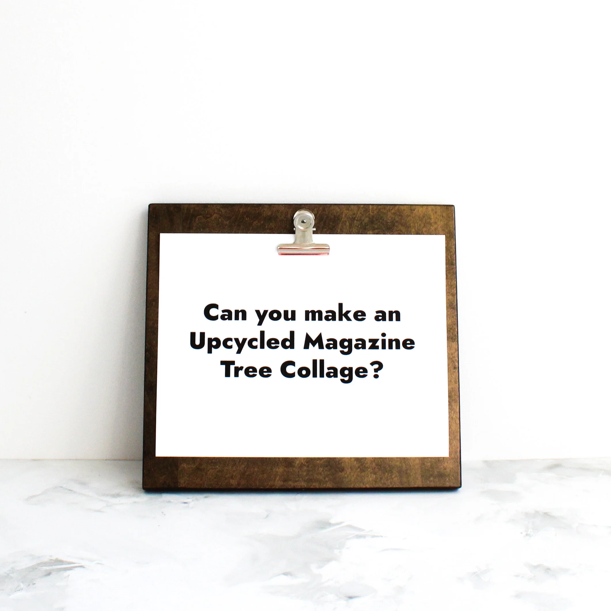 (1) Decide what colors you’ll include in your collage. I chose brown for the trunk, green for the leaves, and blue for the sky; however, you’re the artist and can choose whatever colors you like! (2) Search the magazines for your colors, and, when you find them, cut little pieces and set them aside. Gauge how many scraps of each color you’ll need based on the size of your canvas and the design you envision. (3) Once you have enough scraps, you can start gluing. Similar to putting together a puzzle, it helps to set up all the edge pieces and some of the background, in this case the sky, first. Once that is in place, start creating the trunk and leaves by adding those scraps — in some cases they will overlap on top of the “sky” pieces. (4) Keep gluing scraps until your entire canvas is covered, and don’t be afraid to overlap the scraps!